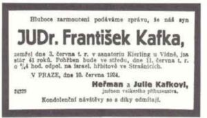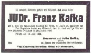 Die tschechische und die deutsche Todesanzeige Frauen Dreimal war er verlobt, geheiratet hat er allerdings nie. Er wurde mit Julie Wohryzek und mit Felicia Bauer sogar zweimal verlobt. Kafka war mit Milena Jesenská sehr eng befreundet, hauptsächlich aufgrund brieflicher Kontakte und weniger aufgrund eher enttäuschender Begegnungen. Kafka schreckte vor Milenas leidenschaftlichem, forderndem Charakter zurück se lekal. Jesenská übersetzte aber als erste einige seiner Erzählungen ins Tschechische. In seinen letzten Lebensjahren lebte Kafka mit Dora Diamant zusammen. Krankheit Bei Kafka brach eine Lungentuberkulose aus. Mitte 1922 wurde Kafka pensioniert. Er starb am 3.Juli 1924 in Kierling bei Klosterneuburg in der Nähe von Wien an Tuberkulose. Er liegt in Prag Straschnitz begraben. Werk Erzählungen-„Die Umwandlung“, „ Beschreibung eines Kampfes“, “Das Urteil“, „Blumfeld, ein älterer Junggeselle“, “In der Strafkolonie“, „Ein Landarzt“. Romane- „Der Prozess“,“ Das Schloss“ und das Romanfragment „Der Verschollene“. Max Brod machte dieses Fragment unter dem selbst gewählten Titel „Amerika“ bekannt.
