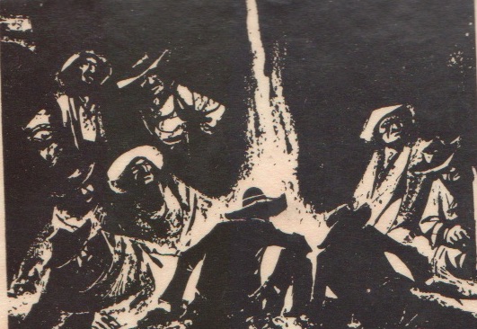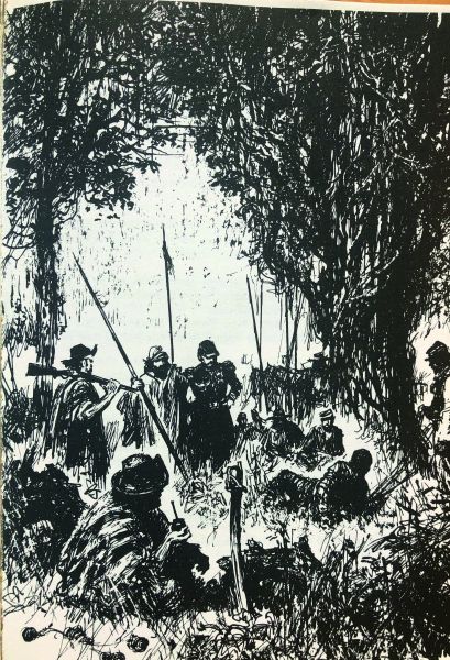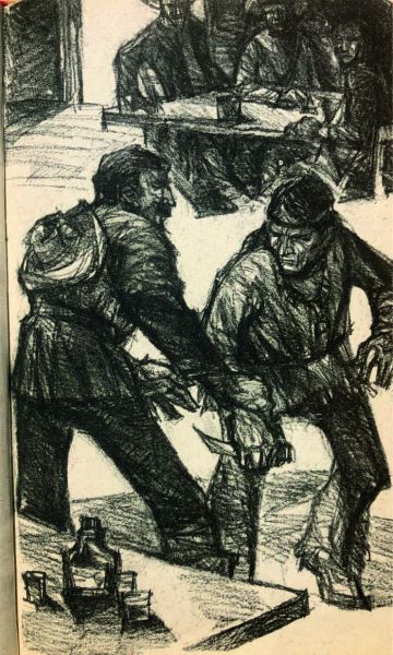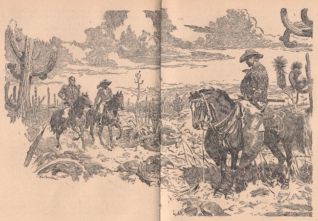 Burianova ilustrace ke knize Duch Llana estacada, SPN Praha 1959, Old Shatterhand očekává na poušti dva slavné trappery.