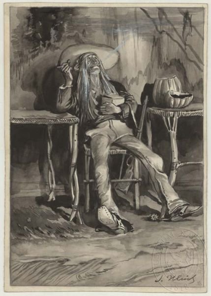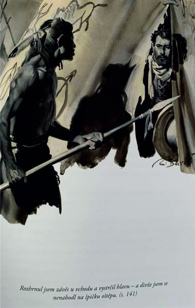 Mayovky jsou mnohem starší a tak bude zajímavé podívat se na prvotní české ilustrace. I v minulosti se totiž nemáme za co stydět. Počáteční vydání knih Karla Maye v Německu ještě nebyla ilustrována a s tím, jak se May stával slavným, začala se objevovat vydání s dobovými ilustracemi. Když se knihy kolem přelomu století vydávaly u nás, objevily se v knihách vedle německých malířů i čeští. Tak se v knihách vedle významného německého ilustrátora Clause Bergena (1885-1964) už ve čtyřicátých letech objevily i obrázky Zdeňka Buriana - třeba společně - v jedné knížce. Ale ti úplně první významní malíři, ilustrátoři vyzdobili knihy už kolem roku 1902: Věnceslav Černý (✝︎1936), který studoval s Maroldem, věnoval se výhradně ilustraci a zakládal Mánes v Praze a Josef Ulrich (✝︎ 1930), jehož obrazy dnes na aukcích nedosahují tak vysokých cen jako ty od Černého. Dlužno podotknout, že od Černého jsou v prodeji ilustrace k Mayovi, ale od Ulricha nikoli. Vynikající kvalitu obou kreslířů zde doložím ukázkou. Pokud chcete vidět více z jejich tvorby jsou níže uvedeny odkazy na www.esbirky.cz. Na uvedených stránkách najdete spoustu ilustrací a můžete se potěšit. Věnceslav Černý, ilustrace ke knize Třemi díly světa - V zemi půlměsíce (originál Německá srdce) vycházející v nakladatelství Alois Hynek v Praze roku 1904 bez souhlasu Karla Maye. Ilustrace (odtud i naše ukázky) Věnceslava Černého najdete na: https://www.esbirky.cz/hledat/rychle/vysledky?order=relevance&itemsPerPage=96&keywords=věnceslav+černý