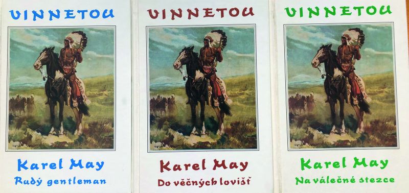 První povídka s tématikou Vinnetou se objevila roku 1875 a byl to Old Firehand. Od roku 1879 známe už postavu Old Shatterhanda a od roku 1881 se známe s Old Shatterhandem na Blízkem východě s jeho arabským jménem Kara Ben Nemsi (Karl z Německa) a jeho sluhou Hadži Halefem Omarem. Vinnetou - první díl ze tří. Kniha z roku 1893 vyšla ve vynikajícím překladu Vítězslava Kocourka v roce 1965 ve Státním nakladatelství dětské knihy (KOD) díky uvolnění v šedesátých letech. Znovu vyšla (v dokonalé úpravě - viz foto níže) v letech 2014-18. May vypráví své příběhy v Ich formě, čímž dodává povídkám na aktuálnosti. Knihy se odehrávají v celém světě (Sam Hawkins byl i v Rusku), ale nejvíce populární se staly příběhy ze tří lokací: 1. z Divokého západu - romány: Syn lovce medvědů 1887, Duch Llana Estacada 1888, Poklad ve Stříbrném jezeře 1890, Vinnetou 1893 (kniha je vlastně spojení pěti novel, které May již publikoval dříve), Petrolejový princ 1894, Satan a Jidáš (Supové Mexika) 1896, Old Surehand 1897, Černý mustang 1897, Vinnetou 4. (Vinnetouova závěť) 1910