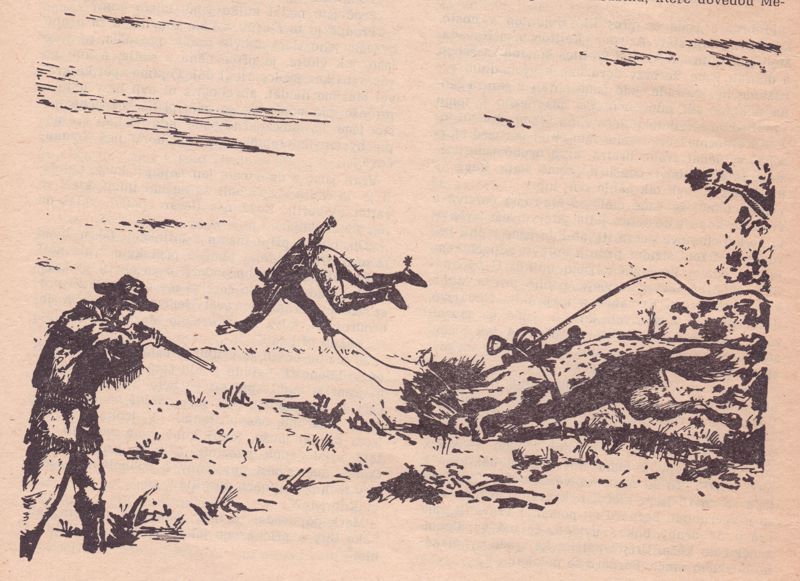 Old Death ukazuje směrem k pueblu (ilustrace Z. Burian)