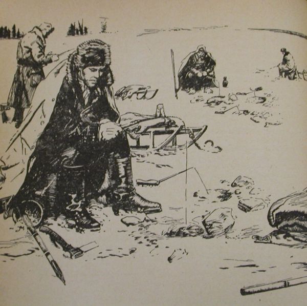 Ilustrace Zdeňka Buriana, lov ryb pod zamrzlou hladinou na jezeře v Rusku