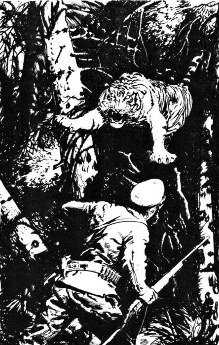 „Časně zrána jsme se sešli před správcovým domem. Při pohledu na německé nimrody jsem se stěží zdržel smíchu. Gersten byl malé postavy s úctyhodným bříškem a velkou, jako meloun kulatou hlavou. Krátké, tlusté nohy trčely v juchtových botách, které mu sahaly až pod pupek. Byl oblečen do křiklavě zelené kazajky, která těsně svírala břicho, ale na prsou se navlnila ve velkých záhybech. Na hlavě měl malou koženou čepici s velkým štítkem. Byl opásán dvojitým pásem na náboje, na zádech mu visel prostorný batoh, polní láhev a 'lovecká brašna. Na krku se mu houpala na tenkém řemínku píšťala. V jedné ruce držel řetízek, který napínal ušlechtilý setr Break. Přes druhou měl přehozenu ručnici věhlasné anglické firmy Holland-Holland a trvalo to chvilku, než si uvolnil pravici, aby mi ji podal na uvítanou.